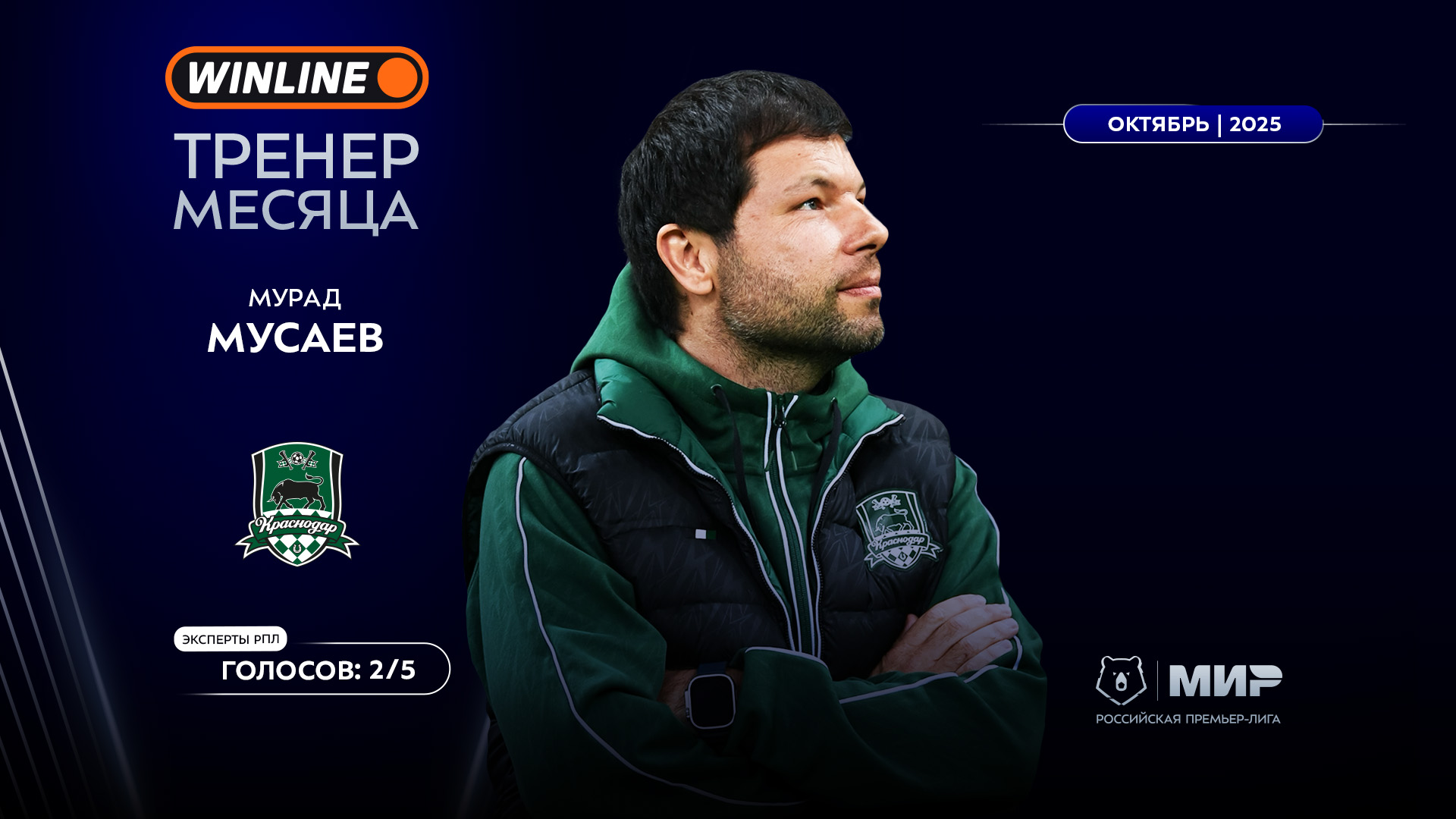 В октябре «Краснодар» стал единственной командой в Мир РПЛ, победившей во всех трёх турах месяца, при этом победы были сухими. В первом матче октября краснодарцы обыграли дома «Ахмат» (2:0), в следующих играх, прошедших после международной паузы, нанесли поражения махачкалинскому «Динамо» в гостях (2:0) и «Рубину» дома (1:0). Эти результаты вернули «Краснодару» единоличное первое место в турнирной таблице. Мусаев стал WINLINE тренером месяца третий раз, предыдущие две награды он завоевал по ходу сезона 2024/25 (сентябрь и октябрь 2024-го).